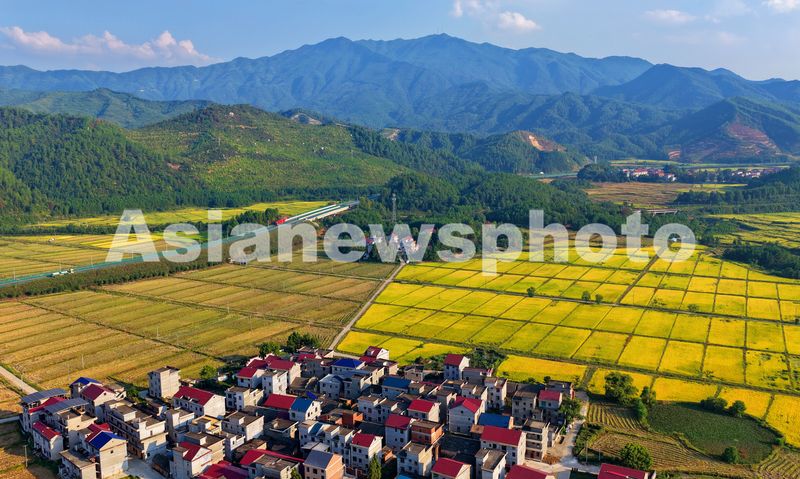 图片说明:10月27日,江西省吉安市吉水县醪桥镇,高标准农田里稻谷金黄,与山丘、民居相映成景,构成一幅丰收时节的和美乡村画卷。