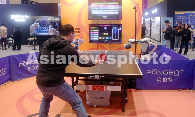 图片说明:2025年10月27日,上海西岸国际科技消费嘉年华上,乒乓球训练AI机器人吸引运动高手挑战。