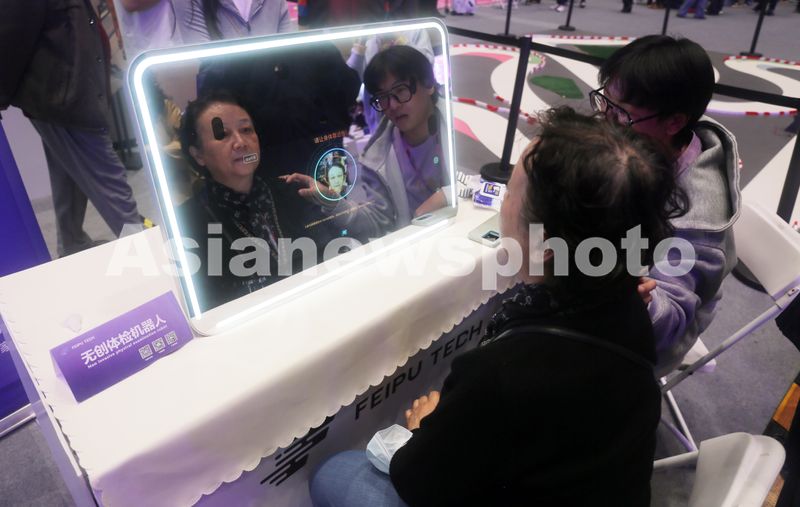 图片说明:2025年10月27日,上海西岸国际科技消费嘉年华上,无创体检机器人为老年人测试各种生命指标。