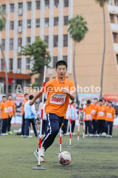 图片说明:2025年10月30日,福建省福州市仓山区,福建师范大学附属中学正在举办66届田径运动会,学生正在进行男子足球运球绕杆项目比赛。
