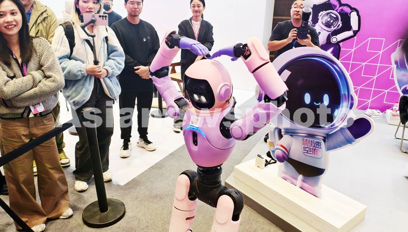 图片说明:2025年10月27日,上海西岸国际科技消费嘉年华上,为著名AI大模型地标“模速空间”代言的家庭陪伴机器人向游客比心。