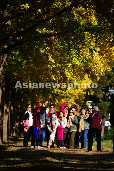 2025年11月3日,游客漫步在北京钓鱼台银杏大道。