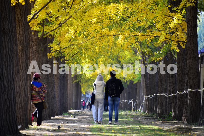 2025年11月3日,游客漫步在北京钓鱼台银杏大道。