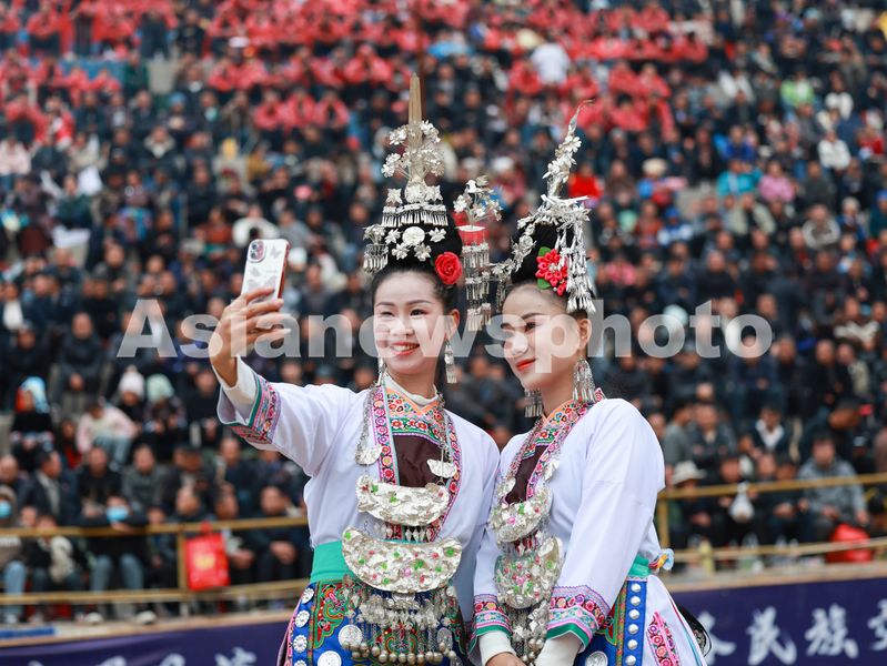 2025年11月1日,在贵州省从江县往洞镇九洞平楼牛塘,侗族同胞牛塘里玩自拍。