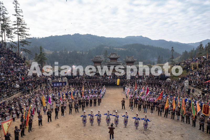 2025年11月1日,在贵州省从江县往洞镇九洞平楼牛塘,侗族同胞在参加文化展演活动(无人机照片)。