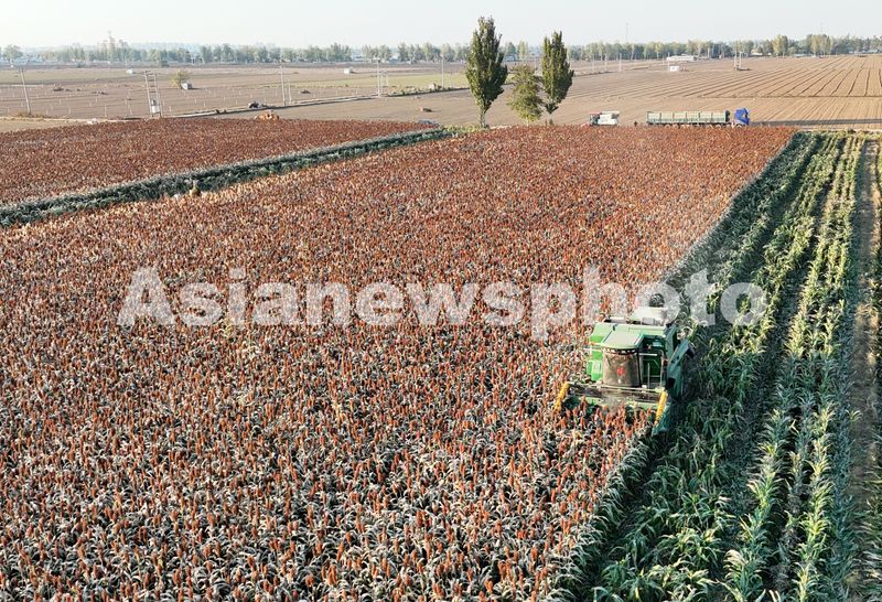图片说明:2025年11月2日,在河北省石家庄市栾城区南高乡北安庄村农田里,农民驾驶大型收割机正在进行高粱收获作业(无人机照片)。