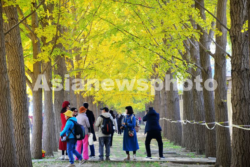2025年11月3日,游客漫步在北京钓鱼台银杏大道。