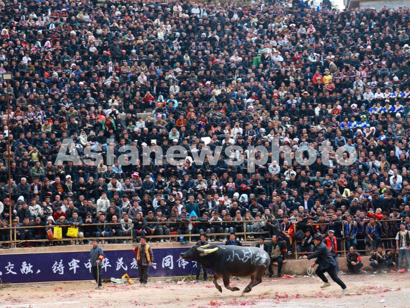 2025年11月1日,在贵州省从江县往洞镇九洞平楼牛塘,侗族同胞催着牛王奔进牛塘去争斗。