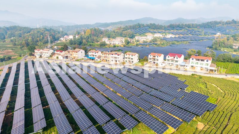 2025年11月2日,湖北省黄冈市英山县杨柳湾镇金鸡岭村,排列整齐的光伏板,与修剪齐整的茶园、错落有致的民居交相辉映,构成一幅乡村振兴美丽画卷。