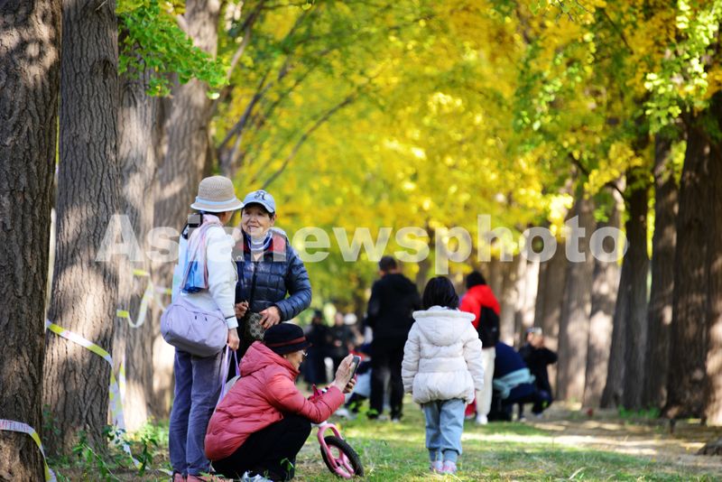2025年11月3日,游客漫步在北京钓鱼台银杏大道。