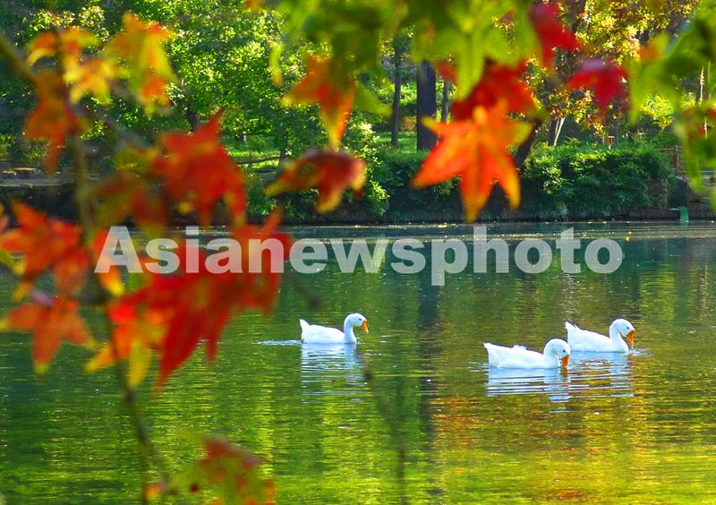 图片说明:2025年11月5日,几只大白鹅在红枫掩映的江苏省苏州市天平山景区池塘游弋。