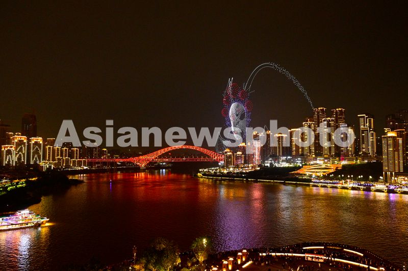 图片说明:2025年11月4日晚,重庆长江岸边,无人机编队绘出巨型脸谱,传统与现代交融,绽放独特城市魅力。