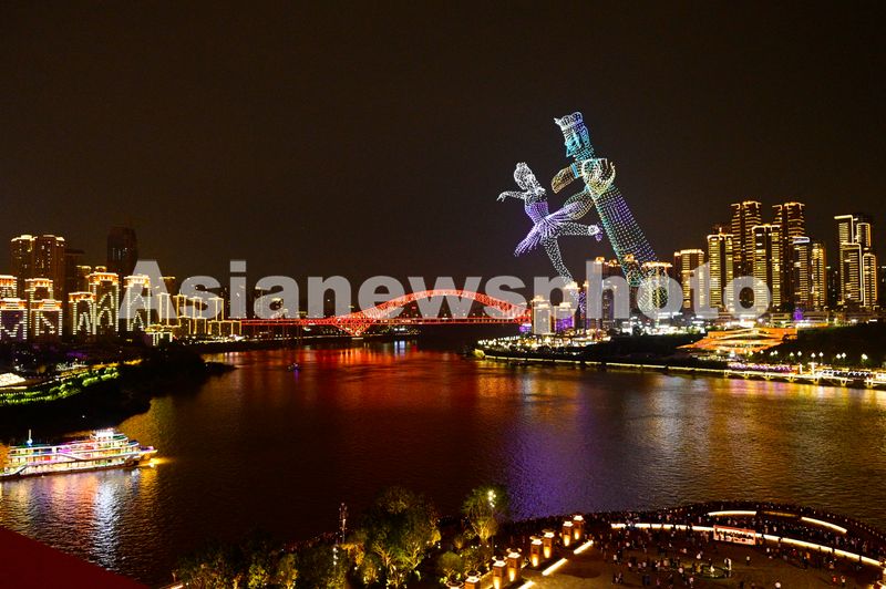 图片说明:2025年11月4日晚,重庆夜空,无人机妙绘三星堆文物“青铜大立人”与优雅的芭蕾舞女演员,跨越时空对话,演绎传统文化与西方文化碰撞之华章。