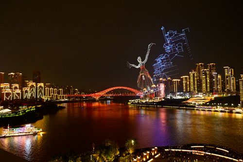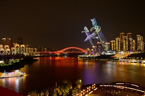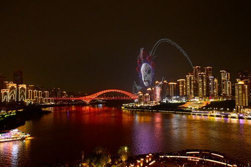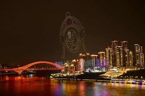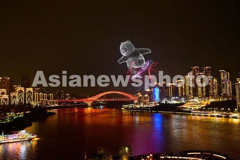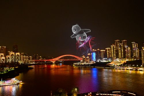 图片说明:2025年11月4日晚,重庆夜色如画,江面波光粼粼,无人机编队组成滑滑板熊猫,灵动可爱,为城市夜景增添一抹奇幻色彩。