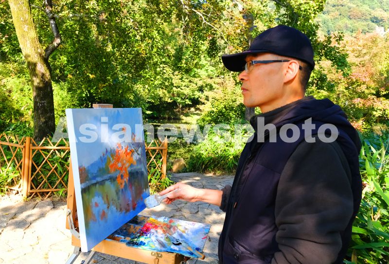 图片说明:2025年11月5日,一名书画艺人在江苏省苏州市天平山景区红枫林现场作画。