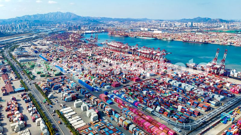 2025年11月5日,在青岛自贸片区,数十艘货轮在装卸货物。