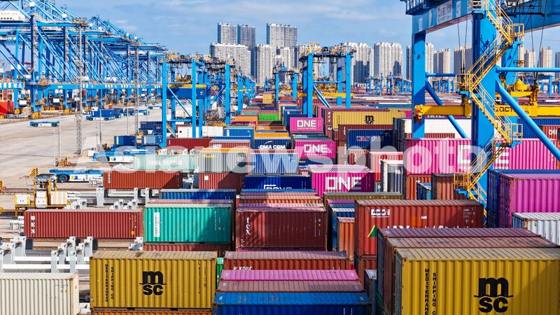 2025年11月5日,在青岛自贸片区,集装箱堆场一派繁忙。