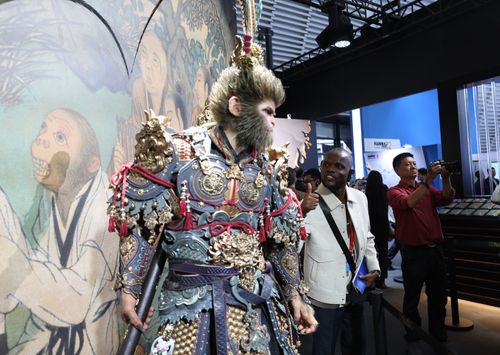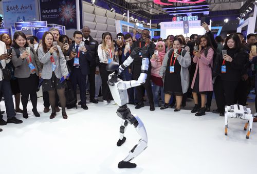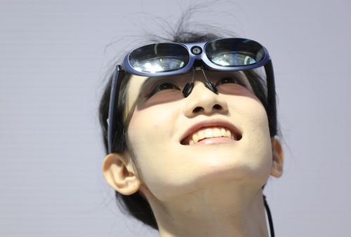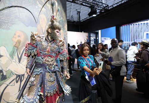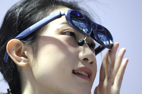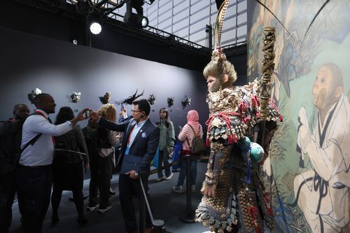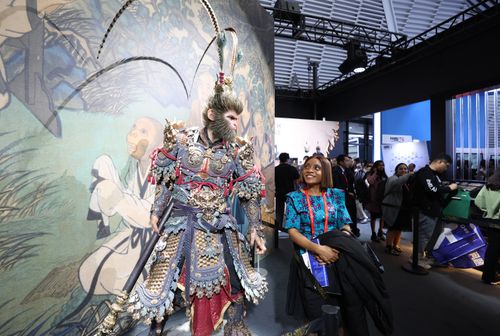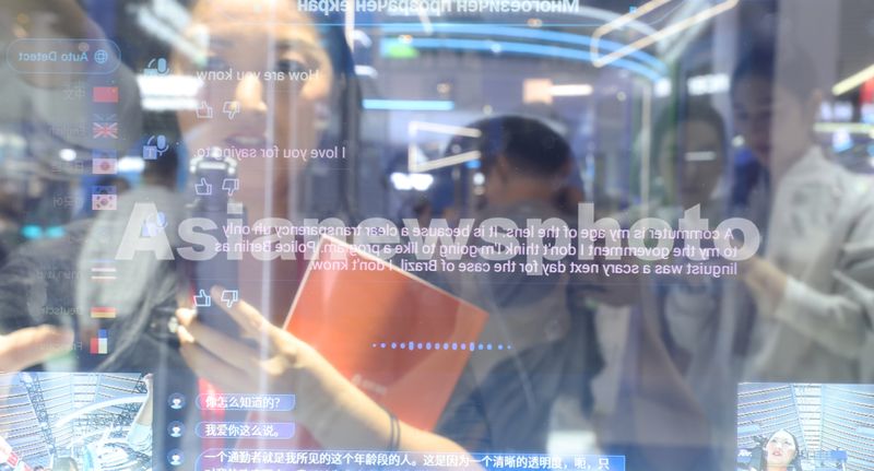 11月6日,参观者体验具有实时翻译功能的多语言AI透明屏。