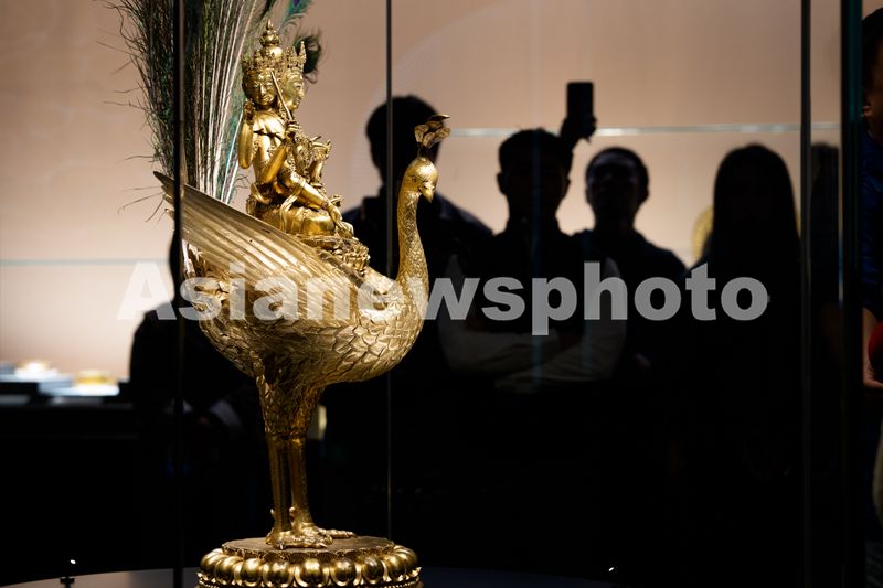 图片说明:11月11日,观众参观展出的明宣德铜鎏金孔雀明王像,现藏于柏林民族学博物馆。