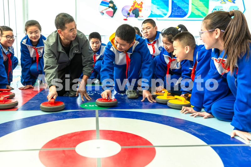 图片说明:2025年11月11日,在甘肃省张掖市第一中学,学生们正在老师指导下练习旱地冰壶。