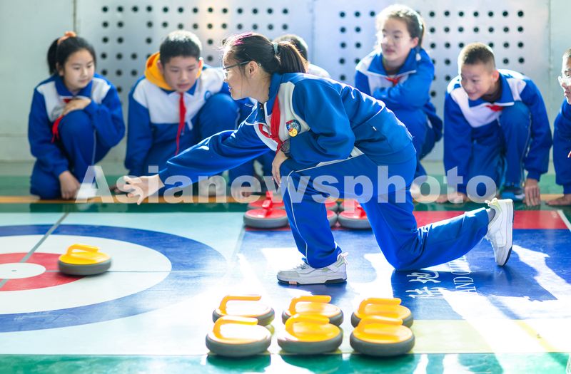 图片说明:2025年11月11日,在甘肃省张掖市第一中学,学生们正在练习旱地冰壶。