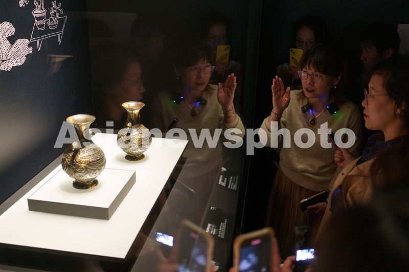 图片说明:11月11日,观众参观同柜展出的乾隆洒金铜天鸡壶(左)与法国仿乾隆洒金铜天鸡壶,仿件为19世纪法国制造。