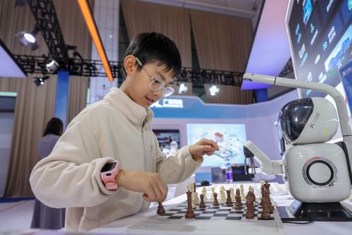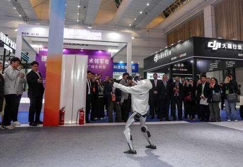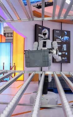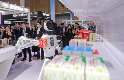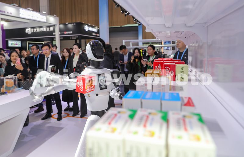 11月12日,在宜宾国际会展中心2025动力电池应用生态展览会,智能机器人模拟展示智能化商超购物场景。