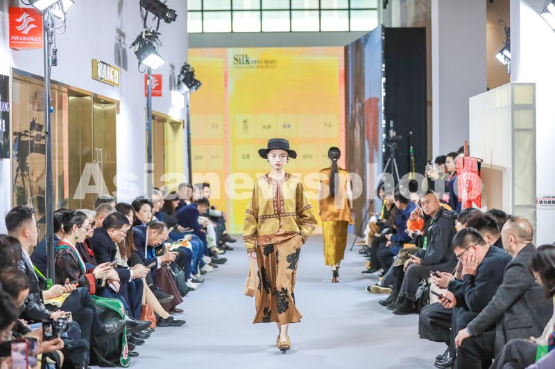 2025年11月12日,位于浙江省湖州市南浔区旧馆街道长三角丝绸文化产业园内,浙江省首届历史经典产业(丝绸)焕新大赛湖州赛区模特穿着真丝服饰正在现场走秀。