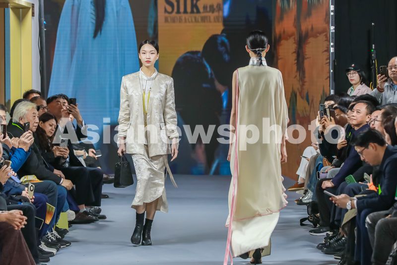 2025年11月12日,位于浙江省湖州市南浔区旧馆街道长三角丝绸文化产业园内,浙江省首届历史经典产业(丝绸)焕新大赛湖州赛区模特穿着真丝服饰正在现场走秀。