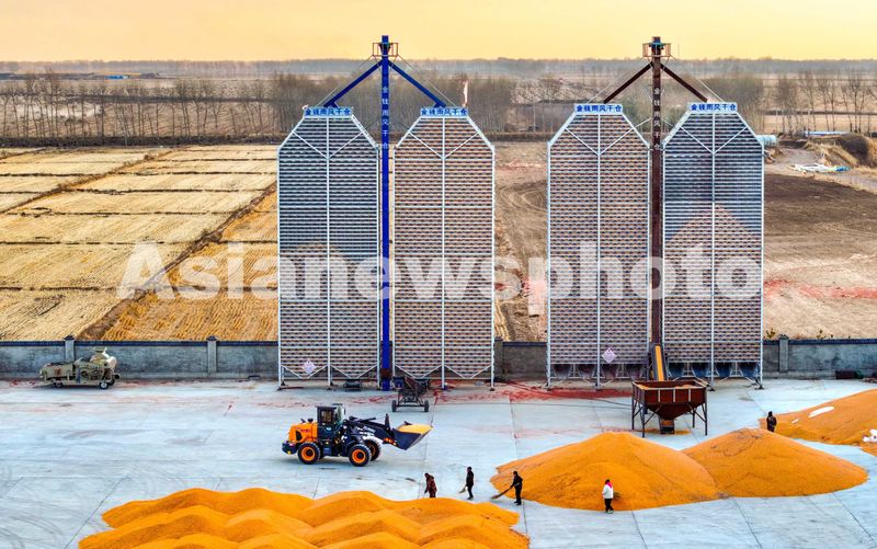 图片说明:2025年11月12日,农民在兴安盟扎赉特旗申丰农牧机械专业合作社籽粒直收储粮装具前收储玉米。