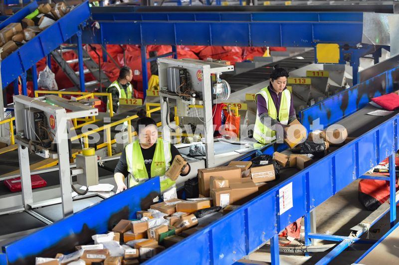 2025年11月10日,在山东省青州市一家快递物流公司,工人在包裹分拣线上忙碌。