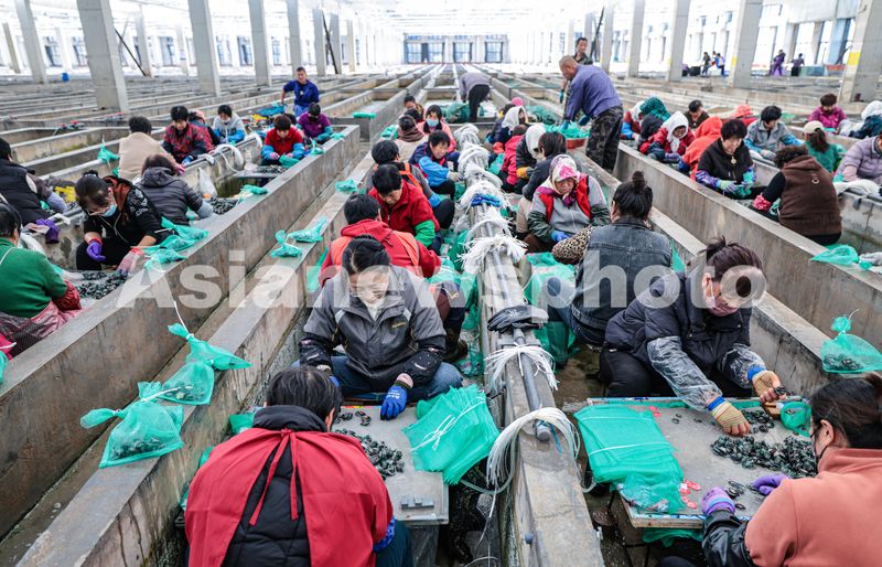 图片说明:2025年11月13日,山东省荣成市爱伦湾鲍鱼港育苗车间内,工人们在开展鲍鱼育苗、分苗、装苗等作业。