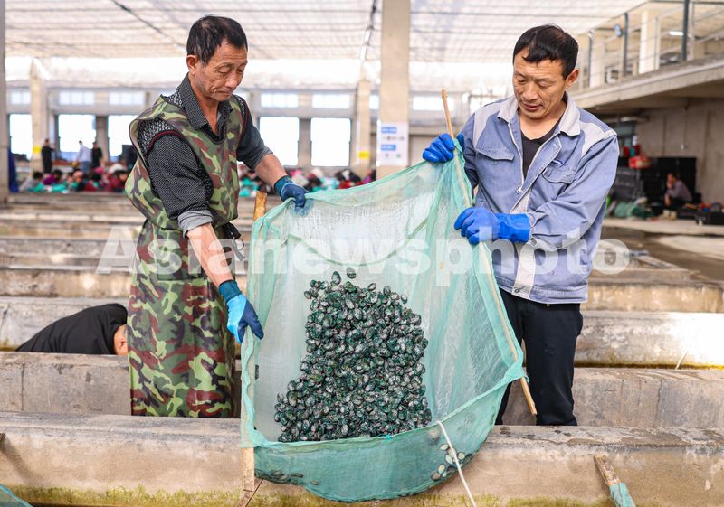 图片说明:2025年11月13日,山东省荣成市爱伦湾鲍鱼港育苗车间内,工人们在开展鲍鱼育苗、分苗、装苗等作业。