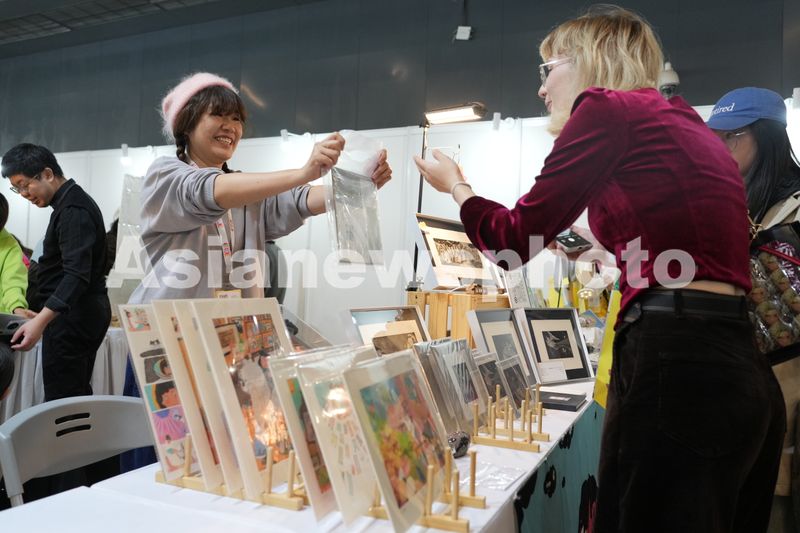 11月14日,中国插画师王臻展示她的铜版画作品。