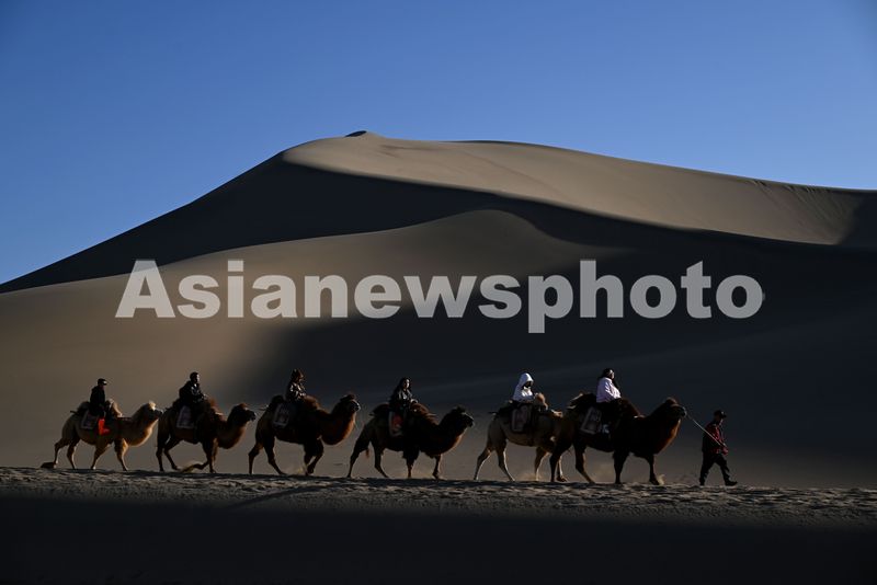 初冬时节,甘肃省敦煌市鸣沙山月牙泉景区景色迷人,美不胜收,游客欣赏大漠风光,体验丝路风情。