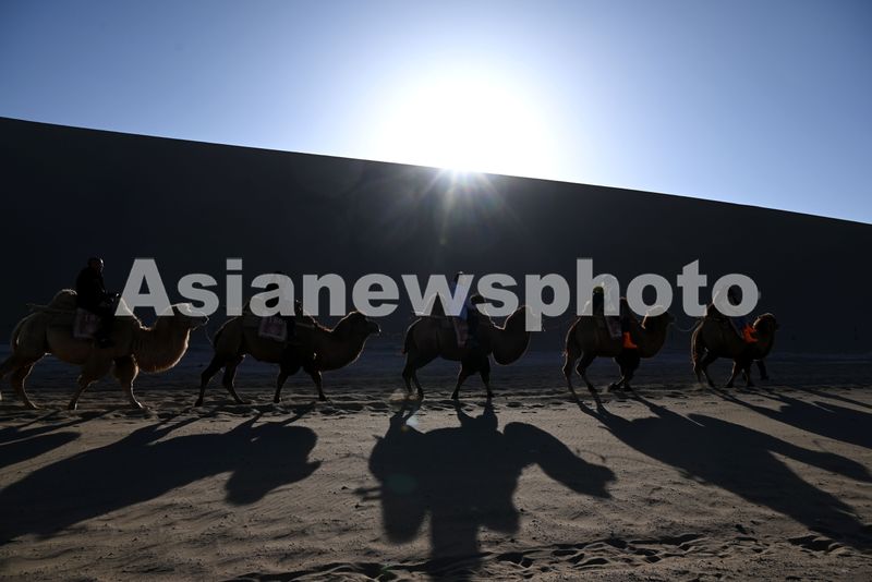 初冬时节,甘肃省敦煌市鸣沙山月牙泉景区景色迷人,美不胜收,游客欣赏大漠风光,体验丝路风情。