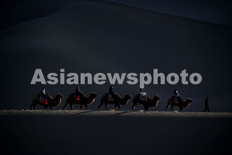 初冬时节,甘肃省敦煌市鸣沙山月牙泉景区景色迷人,美不胜收,游客欣赏大漠风光,体验丝路风情。