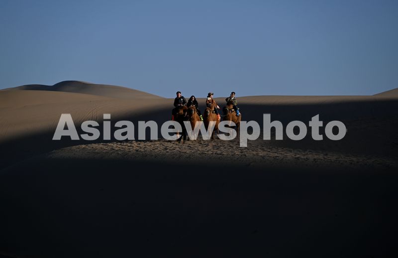 初冬时节,甘肃省敦煌市鸣沙山月牙泉景区景色迷人,美不胜收,游客欣赏大漠风光,体验丝路风情。