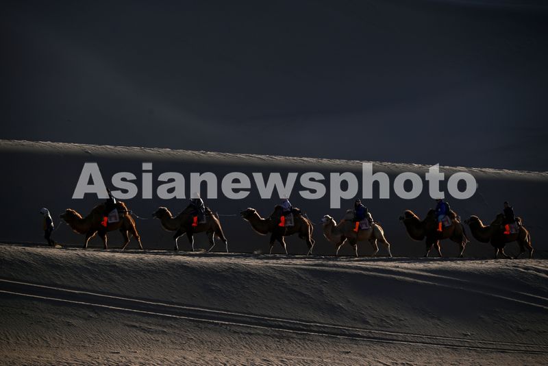 初冬时节,甘肃省敦煌市鸣沙山月牙泉景区景色迷人,美不胜收,游客欣赏大漠风光,体验丝路风情。