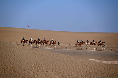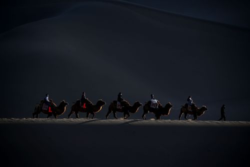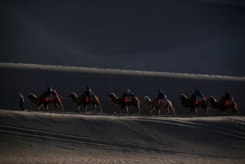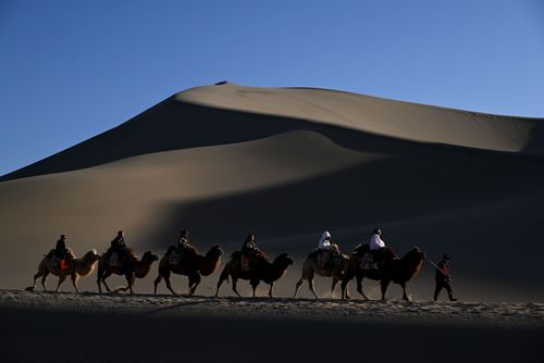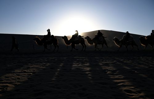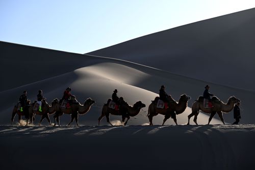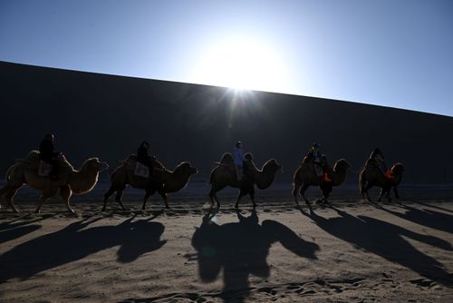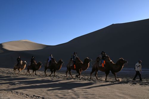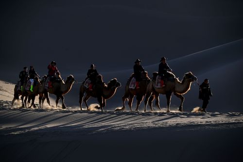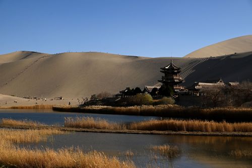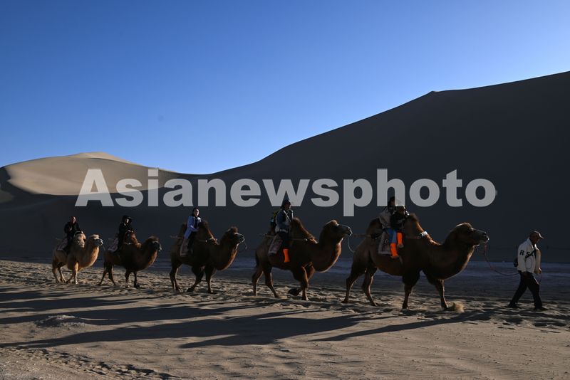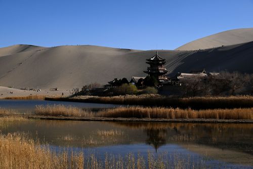 初冬时节,甘肃省敦煌市鸣沙山月牙泉景区景色迷人,美不胜收,游客欣赏大漠风光,体验丝路风情。