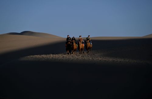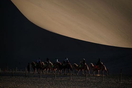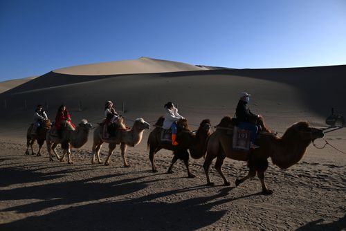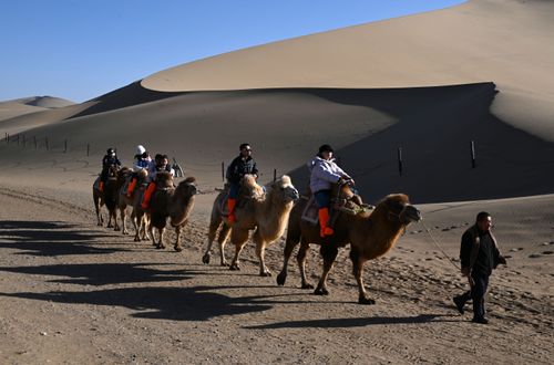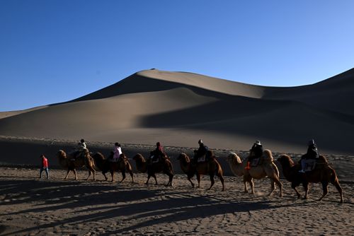 2025年11月15日,游客在甘肃省敦煌市鸣沙山月牙泉景区游览。