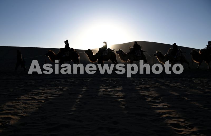 初冬时节,甘肃省敦煌市鸣沙山月牙泉景区景色迷人,美不胜收,游客欣赏大漠风光,体验丝路风情。