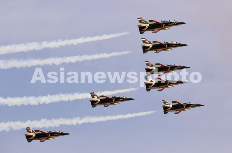 阿联酋骑士飞行表演队换装中国L-15猎鹰高级教练机亮相迪拜航展