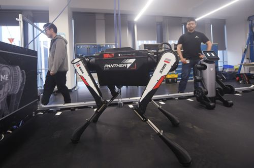 2025年11月18日,在浙大国际科创中心拍摄到的四足仿生机器人“黑豹2.0”。