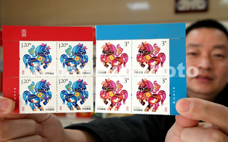 11月18日,中国邮政集团有限公司邯郸市分公司的工作人员展示《跃马添福》《鸿运驰春》贺年专用邮票。