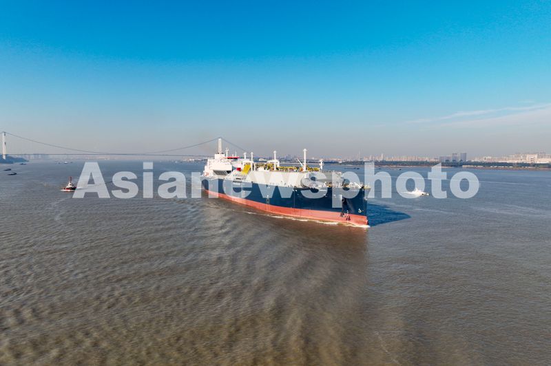 2025年11月20日,由扬子江船业集团建造的17.5万立方LNG运输船“鑫福124”轮行驶在长江靖江段(无人机照片)。