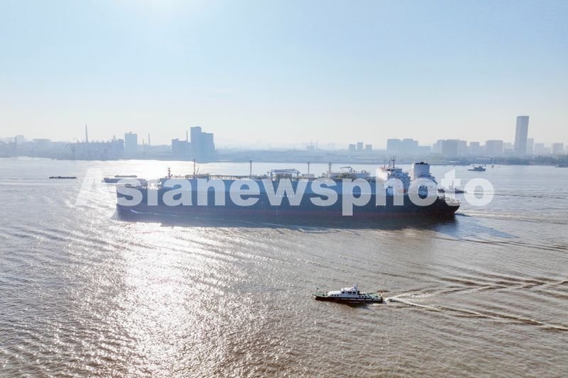 2025年11月20日,由扬子江船业集团建造的17.5万立方LNG运输船“鑫福124”轮行驶在长江靖江段(无人机照片)。