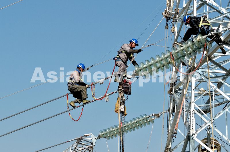 11月21日,在安徽省亳州市谯城区赵桥乡双楼村,国网亳州供电公司施工人员在华佗-曙光牵引站兀入谯城(亳三)变电站220千伏线路b11杆进行高空压接导线。