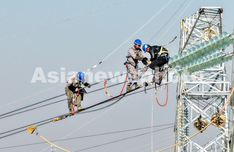 11月21日,在安徽省亳州市谯城区赵桥乡双楼村,国网亳州供电公司施工人员在华佗-曙光牵引站兀入谯城(亳三)变电站220千伏线路b11杆进行高空压接导线。