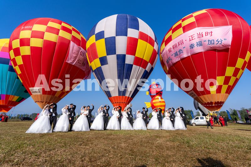 图片说明:2025年11月22日,浙江金华,武义县大斗山飞行营地,青年男女正在参加热气球浪漫集体婚礼。